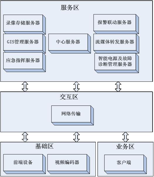 SHR-FFPS V2森林防火視頻監控預警管理系統以前端監控設備和視頻編碼器為基礎,采用C/S架構,通過交互區內的網絡等傳輸鏈路,將數據及信息發送到服務區內的各種服務器。業務區內的客戶端對監控業務進行管理和處理。下圖為系統架構示意圖。
